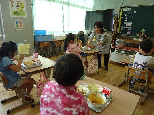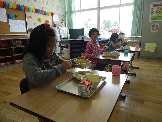 4月15日(金)は、1年生にとって、待ちに待った給食の始まりの日でした。朝から、「今日、給食だよ。」と話し、3時間目には「おなかすいた。」と言っていた1年生。この日の献立は,「むぎごはん、ポークカレー、ドレッシングサラダ」でした。6年生に配膳をしてもらい、一口食べて、一斉に「おいしい。」と笑顔一杯の初めての給食でした。