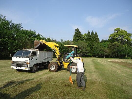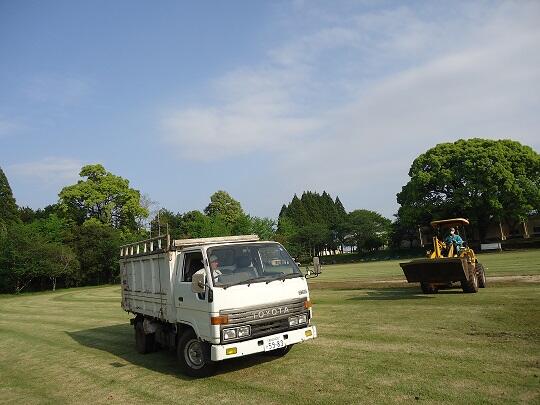 茶臼原小学校は、天然芝の運動場です。緑がとても鮮やかで、子どもたちが運動やサッカーをするにも素晴らしい環境です。ただ、芝は管理が重要となり、月に1度、多いときは、月に2、3度教頭先生が中心になって芝刈りをしています。刈り取った芝は、子どもたちのために、PTAの黒木健悟さんと大﨑貞伸さんが、ホイールローダーやトラックで運んでくださいます。感謝です。