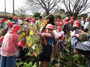 1月8日(火)、10月にみんなで学校の畑に種を蒔いた、地域の伝統野菜である「米良大根」の収穫をしました。子ども達はこれまでに自主的に草取りをしたり、毎日のように様子を見に行ったりして、成長を楽しみにしてきました。引き抜いてみると、別名「糸巻き大根」という名の通り、赤紫色の筋の入ったものや、丸いもの、長いもの等形は様々ですが、みんな大喜びでした。