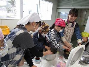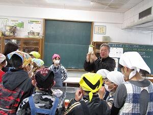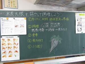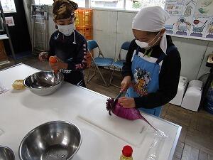 1月11日(金)先日収穫した「米良大根」の調理を5・6年生が行いました。当日は、米良大根の種を提供してくださった「黒木農園」の方も来てくださり、米良大根についての説明や野菜の栽培等についてのお話もしてくださいました。