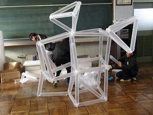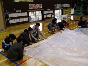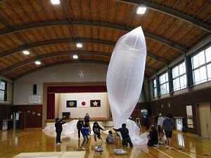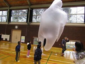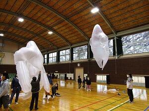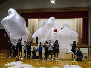 1月30日(木)芸術家派遣事業最終日でした。昨日までの音楽室での創作活動から、今日は体育館に場所を移しての活動となりました。人型に切った大きなビニールシートを貼り合わせて、とても大きな袋状のものを作り、それにドライヤーで空気を送り込むと、見る見る間に膨らみ、空中に浮き始めると、子ども達から大きな歓声が沸き上がりました。