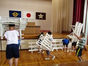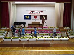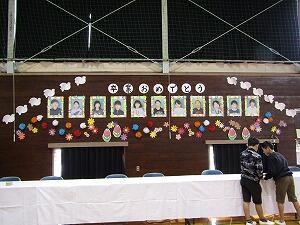卒業式まであとわずかとなりました。式の練習だけでなく、式場準備も着々と進んでいます。19日(火)、4・5年生の児童と職員で式場の前々日準備を行いました。壁面装飾、椅子並べ、プランターの配置等を行い、全体の半分程度の準備が整いました。6年生の晴れの日を祝うに相応しい式場ができあがりつつあります。