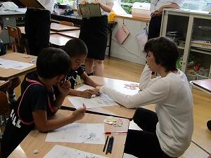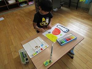 1年生の教室をのぞいてみると、図工の授業で初めて絵の具を使っていました。色の出し方、混ぜ方、筆の使い方等を丁寧に教えてもらいながら、思い思いに色を塗っていました。いつの間にか顔にも塗っている子どももいました!