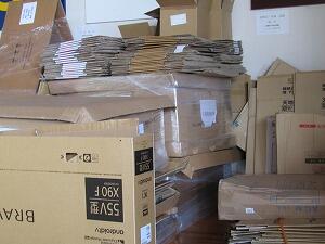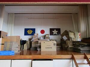 今本校の体育館には保護者の方々の手により連日のようにダンボールが持ち込まれ、ステージにはダンボールの山ができつつあります。