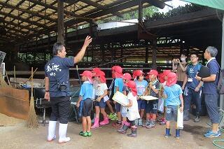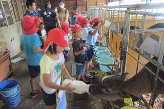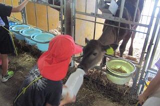 1~3年生が生活科と社会科の学習の一環で校区内にある肉用牛生産農家とその直売所の見学に行きました。生まれたての子牛にミルクをあげたり、牛舎を見学したりしたりした後、直売所の見学とお話を聴きました。