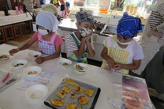 まず、スイートポテトは、おいもをきれいに洗って、切って、皮をむいて、レンジで温めて、つぶして、形を作って、卵を塗って、オーブンで焼くという工程をみんなで協力して教え合いながら楽しく作っていました。焼きあがる間には「ふかしいも」を蒸していました。
