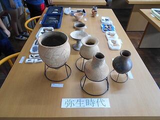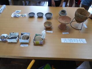 机の上には、所狭しと旧石器時代・縄文時代・弥生時代・古墳時代ごとに土器や石器・鉄器が並べられました。