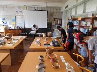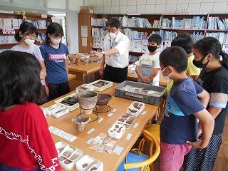 今日は、穂北小学校の永田校長先生に来ていただき、土器や石器の実物を見ながら、旧石器時代から古墳時代までの時代の様子について学びました。