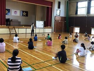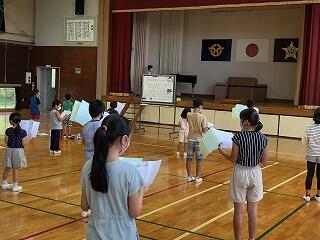 今日は、6月の全校集会が行われました。全校児童45名ですが、密を避けるため、体育館の窓やドアは全て全開し、体育館のフロアいっぱいに広がって、十分な間隔を開けて行いました。