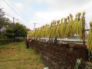 束にした稲は、プールのフェンスに一週間ほど天日干しをして水分を飛ばしていきます。