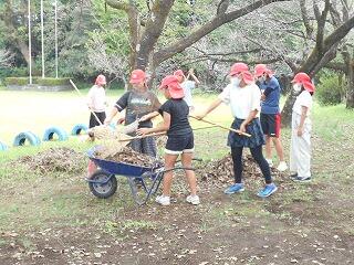 6年生が、月曜日と木曜日の朝に草取り(取った草はそのまま敷き詰めて堆肥にしています。)を頑張っています。