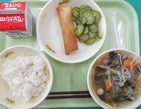 麦ご飯、野菜スープ、中華春巻、添えキュウリ、牛乳、です。