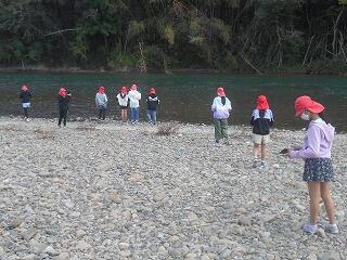 実際に川原に降りて石の形を観察しました。実際に見学することで、外側の浸食のはたらき、内側の堆積のはたらきがあることに気付きました。