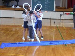 表現の仕方を学んだ後は、グループごとに道具を使ってどんな生き物を表現するのか話し合い、実際に演技してみました。