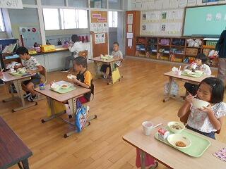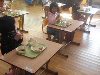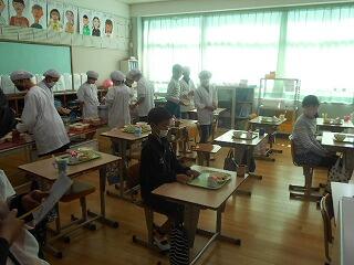 子ども達は、衛生面に気をつけながらしっかり配膳の準備をしています。