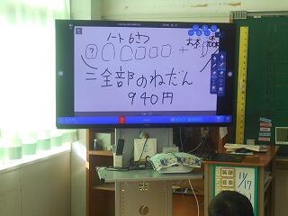 子ども達は、問題文の中で問題を解く鍵となる言葉(分かっていること・何を求めるのか)に線を引いて、子ども達全ての考えを大型テレビに投影します。