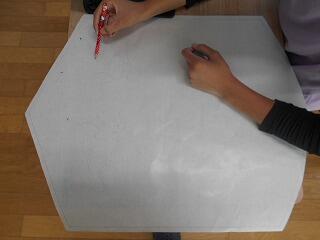 まず、和紙を縦長の六角形にカットします。切り終えたら、表側(スベスベしています)に思い思いの絵を描いていきます!