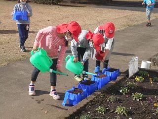 今朝は寒かったのですが、9時を過ぎると太陽の日差しもサンサンで、暖かくなりました。この穏やかな日差しの中で、1年生が「チューリップの球根」を植えました。
