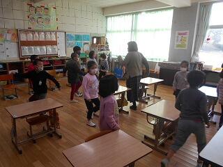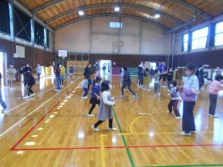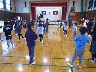 今日は、月に一度の全校音楽です。今日のテーマは「音楽と共に楽しく身体を動かす」です。45名の全校児童は、全校音楽を楽しみにしています。
