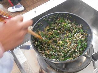 細かく刻んだ大根葉をごま油で炒めていきます。