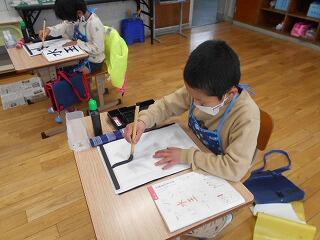 子ども達は、先生の話をしっかり聴いたり、お手本を確認したりしながら「とめ」「はね」「はらい」に気をつけて書いていました。