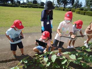 サツマイモを収穫しやすくするために、つる切りを行うそうです!子ども達も一生懸命つるを切っていました。