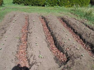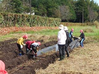畝と畝の間に落ち葉を敷くと雑草が生えにくくなるそうです。また、落ち葉が微生物により分解することで養分にもなるということで、6年生が畝と畝の間に1㎝ほどの厚さで落ち葉を敷いてくれました。