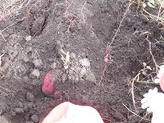 最初に、お芋の周りを掘っていきます。深く掘ったら、お芋を少しずつブルブルッと揺さぶって、お芋と土の間に隙間を作っていくそうです。こうすることで、お芋が途中から折れたり、ちぎれたりしないで収穫できるそうです。