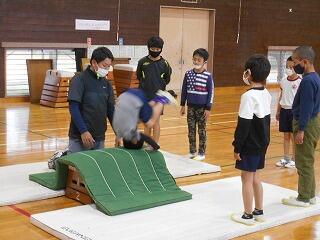 今日は、台上前転にチャレンジしました。跳び箱の高さを低くして、跳び箱上にマットをしきました。