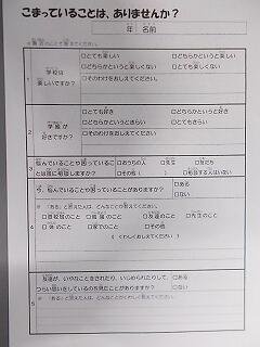 教育相談アンケートが小学部で実施されました。このアンケートは毎月行われています。「学校が楽しいか」「学級が好きか」「悩んでいることや困っていることは誰に相談するか」「今、悩んでいることや困っていることはないか」「友達がいじめられたりしてつらい思いをしていないか」「いじめを受けていないか」などについて、児童の皆さんに書いてもらいます。なお、中学部でも、同様のアンケートを毎月行っています。