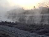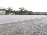 朝の気温が氷点下となり、運動場は霜で真っ白でした。水たまりも凍っており、隣の三納川には霧が発生していました。霧は、非常に冷えた空気が水面近くに流れ込み、水蒸気が冷やされることで発生します。