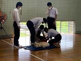 これを受けて、6月7日の中学部保健体育科の授業で、AEDトレーニングキットと訓練用の人形を用いた心肺蘇生法の学習を行いました。生徒は、慣れない手つきながらも、一生懸命に救命措置の練習を行いました。