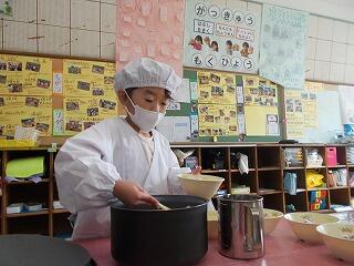 今日から4人だけで給食の準備から後片付けをすることになりました。6年生の様子を見ていた4人は、配膳の仕方がとっても上手でした。自分たちだけで用意した給食は、いつもより美味しく感じたようでした。