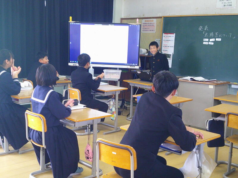 中学部3年生 理科の授業 プレゼンテーションソフトを用いて調べたことを発表している様子です。
