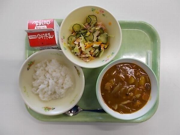 小中学部同じ献立で「麦ご飯、チキンカレー、フレンチサラダ」でした。