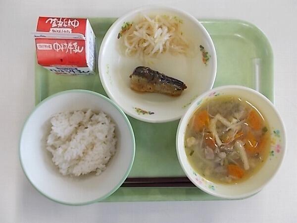小中学部同じ献立で「麦ご飯、いももち汁、さば生姜煮、ゆでもやし」でした。