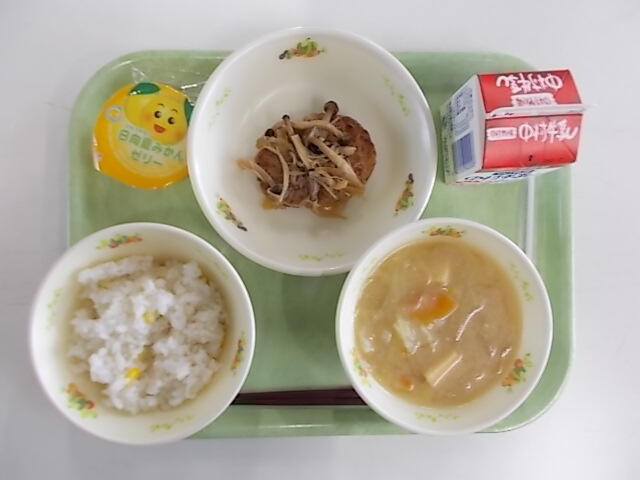 小学部の献立はお楽しみ献立で「減量コーンご飯、春野菜の味噌汁、ハンバーグ照り焼きソース、日向夏ゼリー」でした。