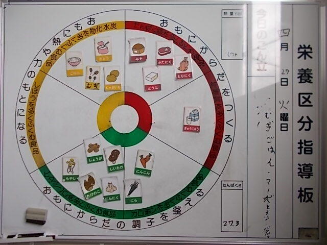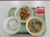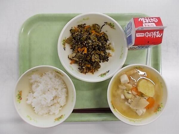 小学部の献立は「麦ご飯、さつま汁、高菜の油炒め」でした。