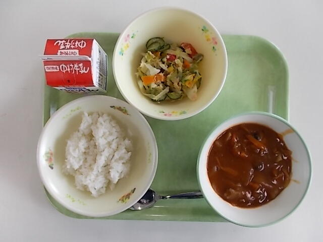 小中学部同じ献立で「麦ご飯、ハヤシライス、ピーマンサラダ」でした。
