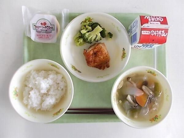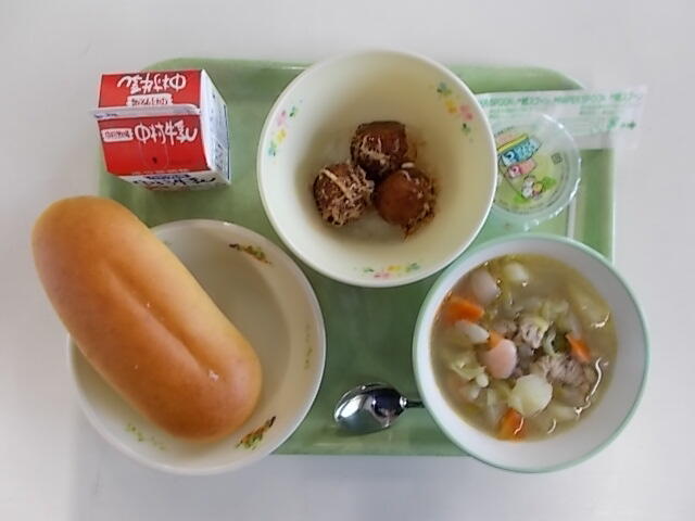小中学部とも同じ献立で「チーズパン、ポトフ、揚げたこ焼き、こどもの日ゼリー」でした。