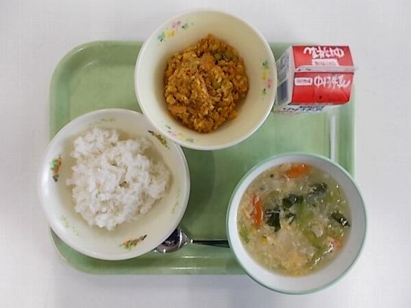 小中学部同じ献立で「麦ご飯、卵スープ、ドライカレー」でした。