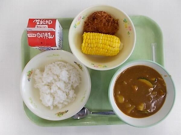 小中学部同じ献立で「麦ご飯、チキンカレー、ヒレカツ、スイートコーン(1/2本)」でした。