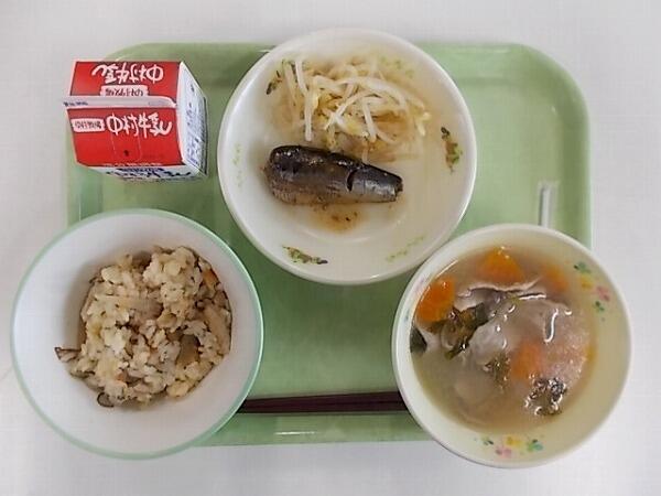 小中学部同じ献立で「鶏五目ご飯、みぞれ汁、鰯梅煮、ゆでもやし」でした。