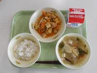 小中学部同じ献立で「麦ご飯(西都の日)、麻婆豆腐、棒々鶏」でした。