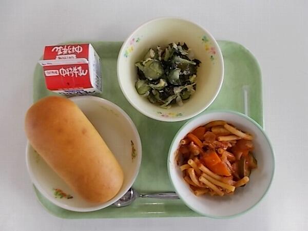 小中学部同じメニューで「チーズパン、鶏肉とマカロニのトマト煮、海藻サラダ」でした。