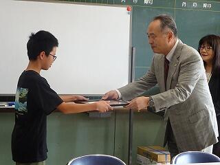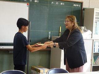 高鍋西都法人会の方が、令和6年度「税に関する絵はがきコンクール」で奨励賞をもらった2人と会長賞をもらった一人児童の表彰にきてくださいました。