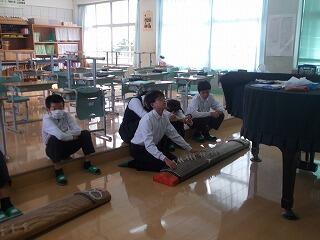 音楽室からは、琴の優しい音色が聞こえてきました。覗いてみると、中学部1年生が、琴を弾いていました。小学校で学習した「さくら」を軽やかに演奏している生徒たちでした。