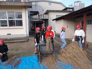 学校に残っている「脱穀機」を使って、脱穀をしてみましたが、子どもたちは、「楽しい」と言いながらも、思っていた以上に難しかったことや今の米作りが先人の工夫を経て、進化していることを感じたようでした。