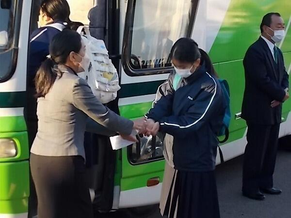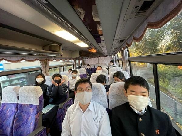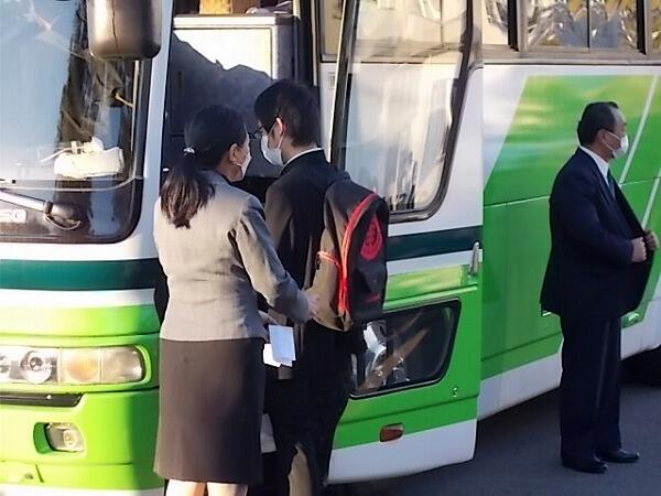 到着時刻が17時30分くらいになることから、帰校式はバスの中で行いました。