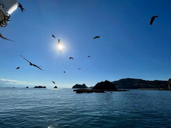 餌付け終了の合図をみんなでやってみましょう…とガイドの方に促され、とんびに向かって両手の人差し指を交差させて作った✖️を見せてみると、あれだけいたとんびがさぁっといなくなりました。とんびの賢さを感じた瞬間でした。